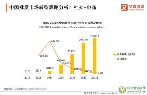 以上述提到的社交電商為例,其作為“社交+電商”的綜合體,所呈現的優勢正得到彰顯,已成為僅次于自營電商、平臺電商的“第三極”。根據艾媒數據中心報告指出:2020年中國社交電商交易規模達20673.6億元,預計2021年中國社交電商行業交易規模將達23785.7億元。