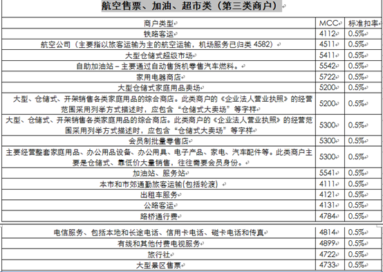 當持卡人在商家的POS機上刷卡消費成功后會打印出小票,上面有商戶編號,從第8位到11位(4位數)即為商家這臺POS機的MCC碼,這個碼對應的就是商家經營的行業,現在民生類的是0.38%的手續費,一般類是0.78%,餐娛類是1.25%。