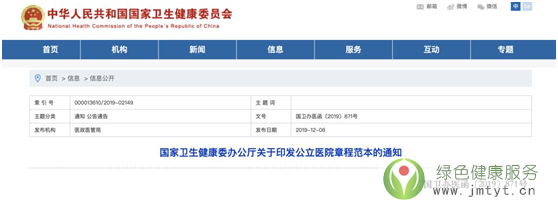 日前,國(guó)家衛(wèi)生健康委網(wǎng)站發(fā)布《國(guó)家衛(wèi)生健康委辦公廳關(guān)于印發(fā)公立醫(yī)院章程范本的通知》(國(guó)衛(wèi)辦醫(yī)函〔2019〕871號(hào))。《通知》明確,各省級(jí)衛(wèi)生健康行政部門(mén)要在2019年12月底前,將試點(diǎn)工作總結(jié)報(bào)送國(guó)家衛(wèi)生健康委醫(yī)政醫(yī)管局。