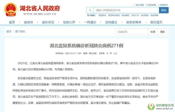 據湖北省人民政府:湖北監獄系統確診271例新冠肺炎,其中湖北省武漢女子監獄確診230例,湖北省沙洋漢津監獄確診41例,均為輸入型病例。湖北省監獄系統全面徹底排查,對疑似病例及其密切接觸者一律隔離觀察,對確診患者一律送診治療,確保全部得到及時救治。目前,全省未發生監獄在押罪犯感染新冠肺炎死亡事件。