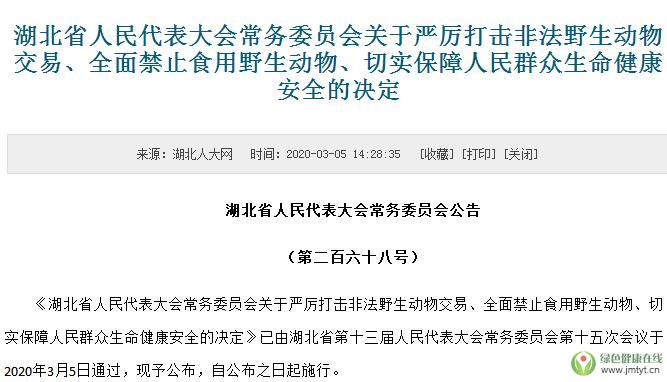《湖北省人民代表大會常務(wù)委員會關(guān)于嚴(yán)厲打擊非法野生動物交易、全面禁止食用野生動物、切實(shí)保障人民群眾生命健康安全的決定》已于2020年3月5日通過,自公布之日起施行。