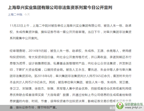 11月22日上午,上海二中院對阜興集團(tuán)、被告人朱一棟、趙卓權(quán)、朱成偉集資詐騙、操縱證券市場一案公開開庭審理。當(dāng)日下午,對阜興集團(tuán)非法集資系列案集中公開宣判。