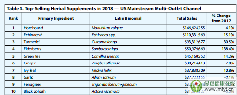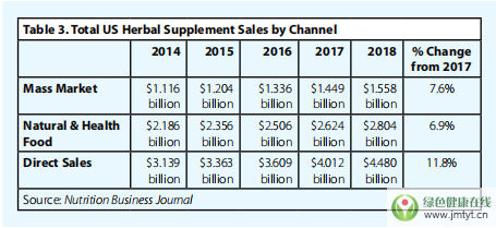 《營養商業雜志》的美國零售數據顯示,2018年草藥的銷售額比去年增長了9.4%,增長額達到7.57億美元,這也是自1998年以來草藥補充劑銷售額最強勁的增長。除了總銷售額的增長,該媒體監控超級賣場、專營渠道以及直銷三個渠道的總零售額也在上升,分別增長了7.6%、6.9%和11.8%
