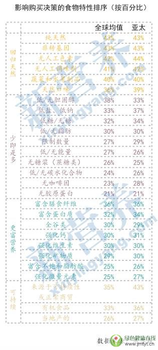 食品健康有很多標準,什么因素會促使主力消費群體決定購買呢?尼爾森列出了27項食品健康屬性,分成回歸天然、少即是多、更富營養、可持續4個種類,以測量購買決策中這些屬性的不同影響。
