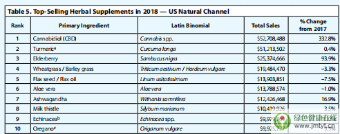 其中接骨木莓是美國各個渠道中最暢銷的五種草藥之一,在超級賣場渠道的銷售額為50,979,669美元,增長了138.4%。在專營渠道銷售額為25,374,666美元,增長了93.9%。同時南非醉茄也是新興的成分,在超級賣場渠道銷售額為7,449,103美元,增幅為165.9%,同時還以16.9%的增長率保持在專營渠道銷售草本植物的前十名,銷售額達到12,426,468美元。而備受爭議的大麻二酚雖然沒有在超級賣場渠道中成為最暢銷的草藥,但它在專營渠道中卻飆升至第一位,銷售額增長了332.8%,達到52,708,488美元。