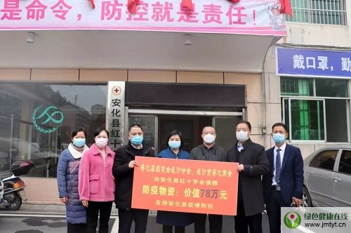 自疫情爆發(fā),安化縣經(jīng)促會長沙分會、長沙市安化商會密切關(guān)注安化縣疫情發(fā)展,得知安化縣緊缺醫(yī)療防護物資,會長胡國安、執(zhí)行會長夏曉輝、常務(wù)副會長兼輪值會長吳余生等領(lǐng)導(dǎo)快速反應(yīng),積極作為,部署秘書處發(fā)動會員支援安化。1月30日,安化縣經(jīng)促會長沙分會、長沙市安化商會向會員企業(yè)發(fā)起“支援安化抗擊疫情”的專項募捐活動,倡議各安商積極行動,支援安化,萬眾一心,抗擊疫情。倡議發(fā)出后,會員們積極響應(yīng),紛紛慷慨解囊,奉獻愛心,更有部分會員排除萬難,親自護送物資前往安化,以解安化燃眉之急。2月1日,會長胡國安捐贈價值10萬元的韓國KF口罩、醫(yī)用外科口罩、消毒液、洗護用品等醫(yī)療抗疫物資并親自護送至安化。