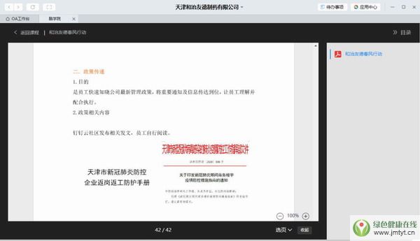 公司通過宣傳海報、溫馨提示牌、宣傳欄等靈活多樣的方式,在企業各個區域做好疫情防控宣傳工作,時刻落實疫情防控措施。同時公司還通過“釘釘云社區”平臺,積極組織員工在線學習《企事業單位復工復產疫情防控措施指南》、《天津市新冠肺炎防控企業返崗返工防護手冊》《新冠肺炎期間商務樓宇疫情防控措施指南》等文件,提升意識強化管理,凝心聚力共同戰疫。