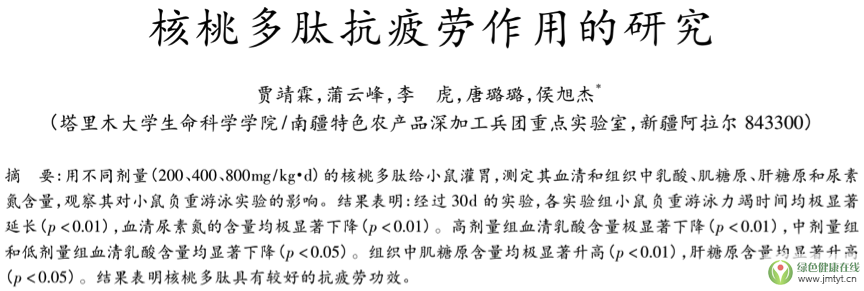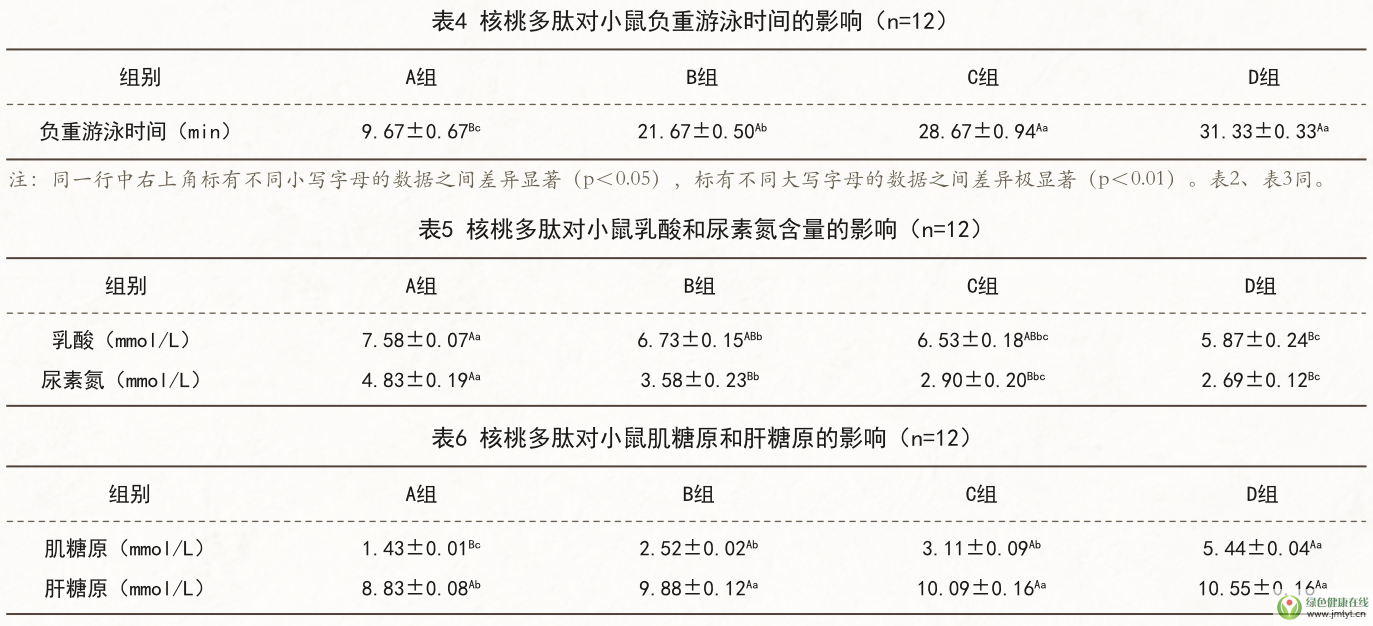 通過實驗,服用核桃多肽的實驗小鼠負重游泳力竭時間均極顯著延長,血清尿素氮的含量顯著下降,血清乳酸含量顯著下降。再次驗證了核桃多肽具有較好的抗疲勞功效。