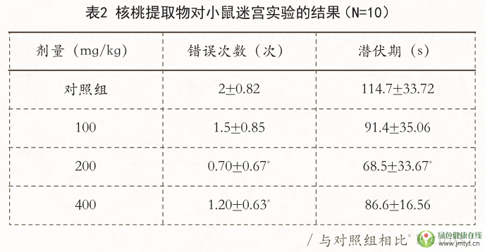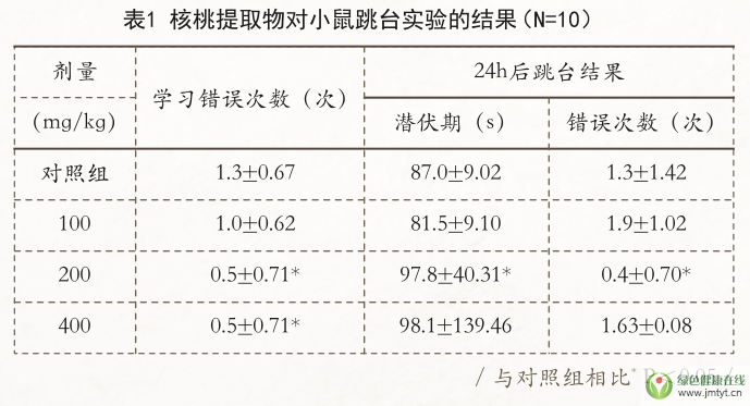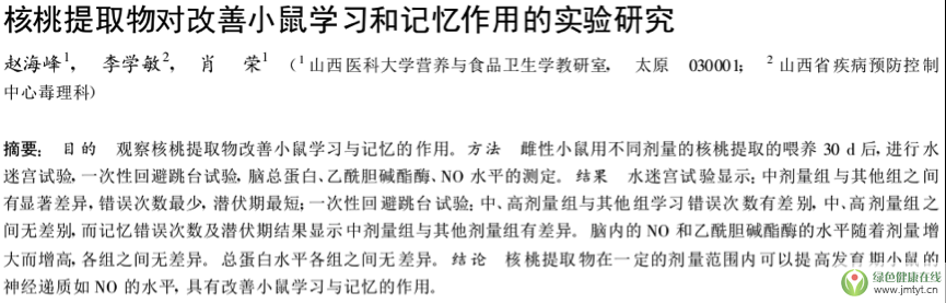 根據實驗數據表明:被投喂適量濃度核桃提取物的小鼠,犯錯的幾率遠低于正常投喂的小鼠。實驗人員通過對小鼠進行一次性回避跳臺試驗、水迷宮試驗以及小鼠腦內神經遞質檢測,得出更加明確的結論:一定劑量范圍內的核桃提取物有助于提高大腦中負責記憶傳遞的神經遞質的水平,從而改善學習和記憶能力。
