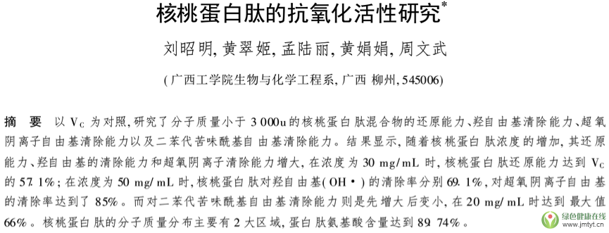 根據實驗結果顯示:隨著核桃蛋白肽濃度的增加,其還原能力、羥自由基的清除能力和超氧陰離子清除能力增大。其中,在濃度為50mg/ml時,核桃蛋白肽對羥自由基的清除率為69.1%,對超氧陰離子自由基的清除率達到了 85%。而對二苯代苦味酰基自由基清除能力則是先增大后變小, 在 20 mg/ mL 時達到最大值66%。