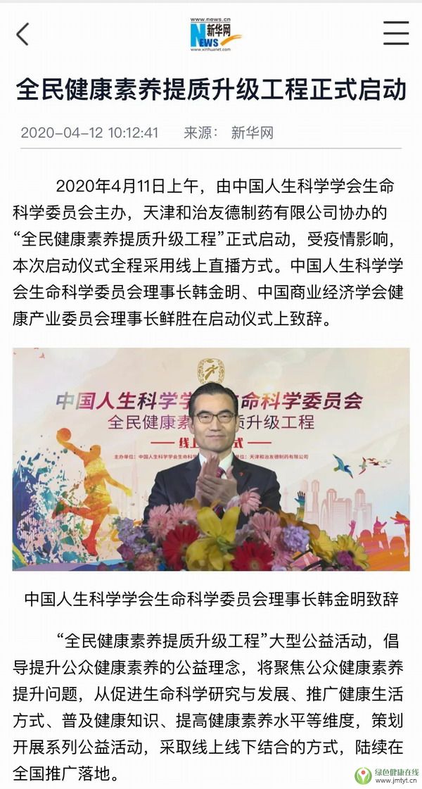 2020年4月11日上午,由中國人生科學學會生命科學委員會主辦,天津和治友德制藥有限公司協辦的“全民健康素養提質升級工程”正式啟動,受疫情影響,本次啟動儀式全程采用線上直播方式。中國人生科學學會生命科學委員會理事長韓金明、中國商業經濟學會健康產業委員會理事長鮮勝在啟動儀式上致辭。