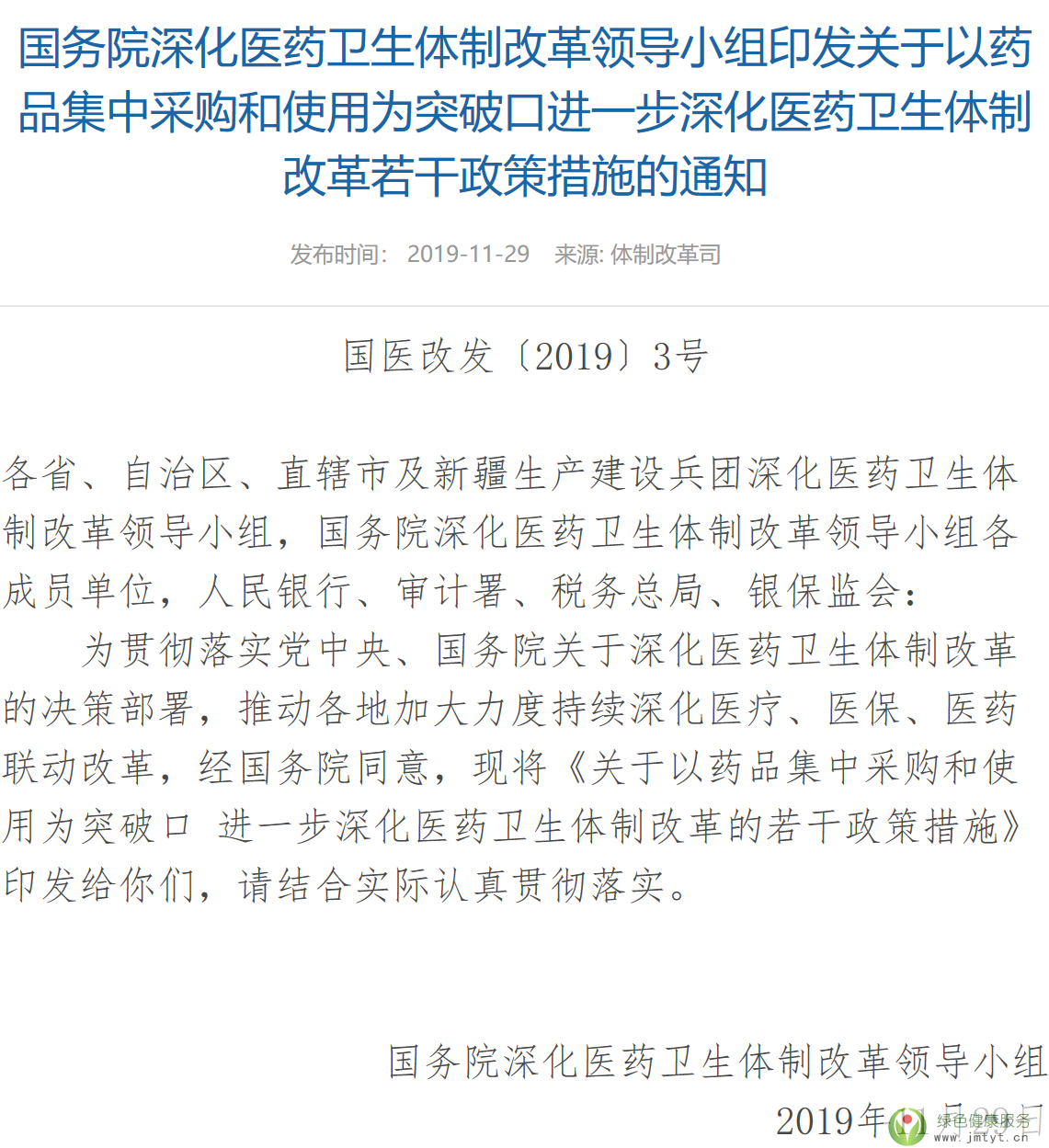 11月29日,國務院深化醫改領導小組印發《關于以藥品集中采購和使用為突破口 進一步深化醫藥衛生體制改革的若干政策措施》(下稱文件),提出了15個方面的改革舉措,推動醫改重點領域和關鍵環節進一步深化,確保群眾從改革中受益。