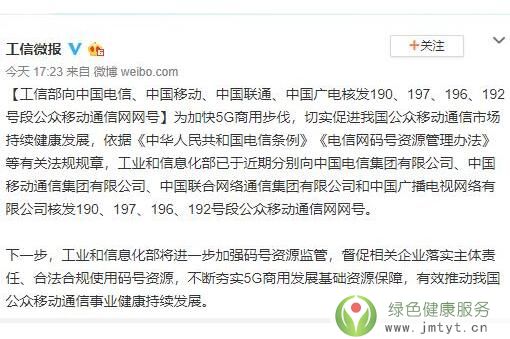 為加快5G商用步伐,切實促進我國公眾移動通信市場持續健康發展,依據有關法規規章,工業和信息化部已于近期分別向中國電信集團有限公司、中國移動通信集團有限公司、中國聯合網絡通信集團有限公司和中國廣播電視網絡有限公司核發190、197、196、192號段公眾移動通信網網號。