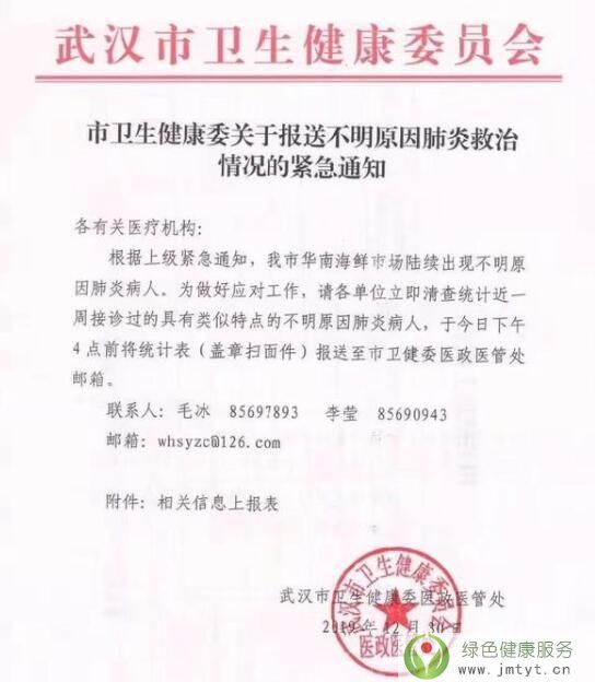 根據網傳《關于做好不明原因肺炎救治工作的緊急通知》《市衛生健康委關于報送不明原因肺炎救治情況的緊急通知》顯示:根據上級緊急通知,武漢市華南海鮮市場陸續出現不明原因肺炎病人。