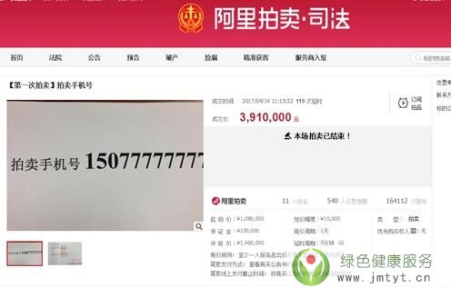 網絡拍賣競價結果,用戶姓名李源通過競買號D7137于2017年04月14日在黑龍江省高級人民法院于阿里拍賣平臺開展的“拍賣手機號”項目公開競價中,以最高應價勝出。該標的網絡拍賣成交價格:¥3910000(叁佰玖拾壹萬元)