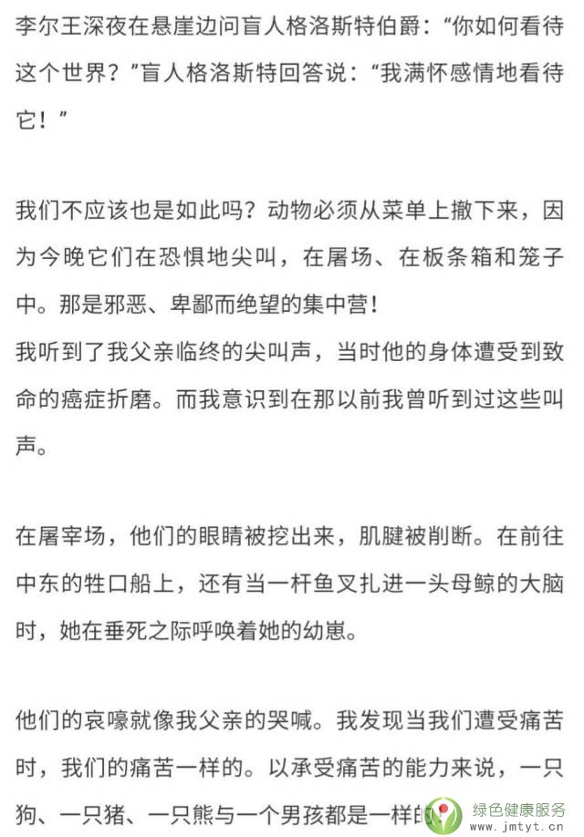 “重要的不是“它們能否思考”或“它們能否說話”,而是“它們能否感受痛苦”。地球能產出滿足每個人需求的食物,但滿足不了每個人的貪婪,憐憫眾生,從吃素開始,我愿做一名素食主義者,“在選擇要烹飪的食物時,避免給任何生命造成痛苦”,也不再只為滿足自己的口腹之欲,而剝奪任何生命。”