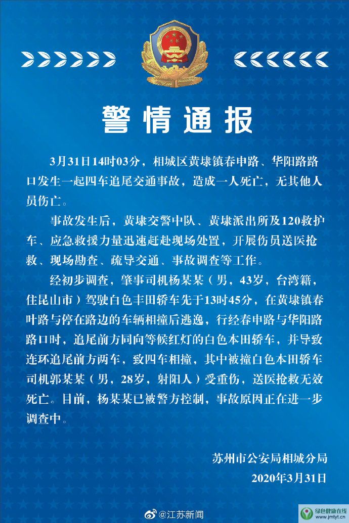1.3月31日14:03,蘇州相城區(qū)黃埭鎮(zhèn)春申路、華陽(yáng)路口發(fā)生一起四車(chē)追尾事故!造成1人死亡,無(wú)其他人員傷亡。