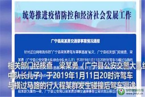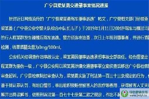 針對近日網絡流傳的“廣寧縣梁某勇駕車肇事逃逸”帖文,廣寧縣相關部門經核查,梁某勇(廣寧縣公安交警大隊綜合中隊長兒子)于2019年1月11日20時許駕車與橫過馬路的行人程某群發生碰撞后駕車逃逸。警方經連夜追查,次日上午找到肇事者,并進行酒精檢測,結果酒精含量為0mg/100mL。