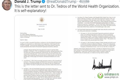 美國總統特朗普在推特上發布了一封寫給世界衛生組織總干事譚德塞的信,威脅稱要永久切斷美國對世衛組織的資助。