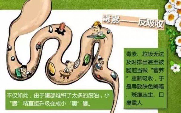 人的腸子有7-8米長(zhǎng),每隔3.5厘米就有個(gè)褶皺,藏有宿便,每人身體里有5—15斤宿便,便秘者可達(dá)15公斤,腸道溫度40-42℃,如果24小時(shí)不排出,就會(huì)產(chǎn)生36種毒素,176種疾病!而且72小時(shí)會(huì)被人體反吸收,大腸周圍還有500多條神經(jīng)通往小腸吸收養(yǎng)分,所以我們必須排毒!