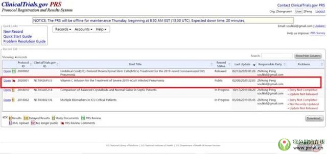 彭志勇教授團隊大劑量維生素C治療新冠肺炎臨床試驗在美國臨床試驗Clnicaltrials.gov網站上登記