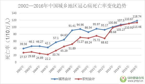 由此可見,作為最常見的心血管疾病之一,冠心病死亡人數(shù)遠(yuǎn)高于其他心血管疾病。在世界范圍內(nèi),冠心病死亡率排在第二位,而在我國(guó)冠心病死亡率則更高。根據(jù)《中國(guó)衛(wèi)生和計(jì)劃生育統(tǒng)計(jì)年鑒(2017)》顯示,2016年中國(guó)城市和農(nóng)村居民冠心病死亡率持續(xù)保持上升趨勢(shì),農(nóng)村地區(qū)冠心病死亡率上升趨勢(shì)明顯,到2015年已略高于城市水平,且男性冠心病死亡率高于女性。